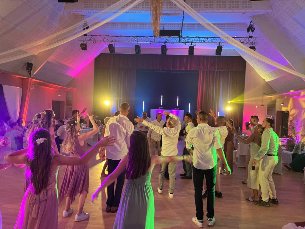 Exemple: la piste est tamisée en bleu pour l’ouverture de bal, toute la salle devient bleue. Nous faisons clignoter les lumières pour votre entrée en salle, toute la salle clignote. Et ainsi de suite..