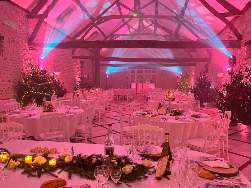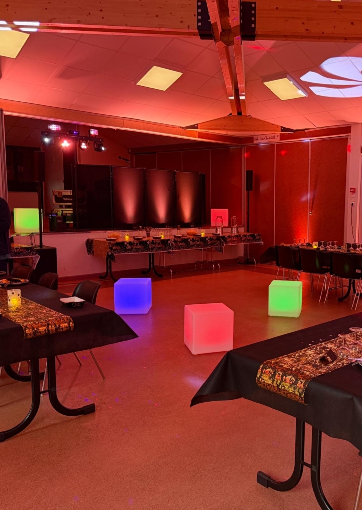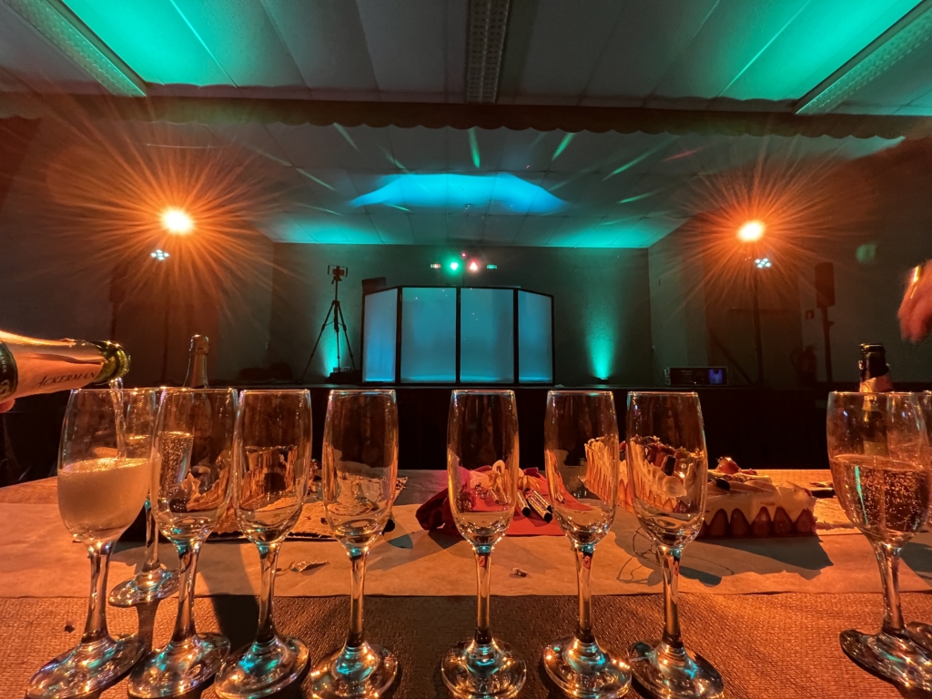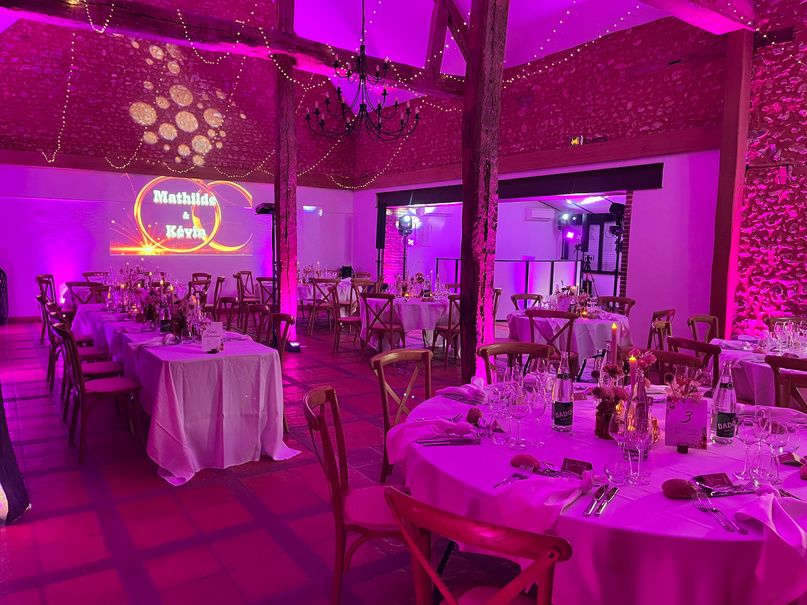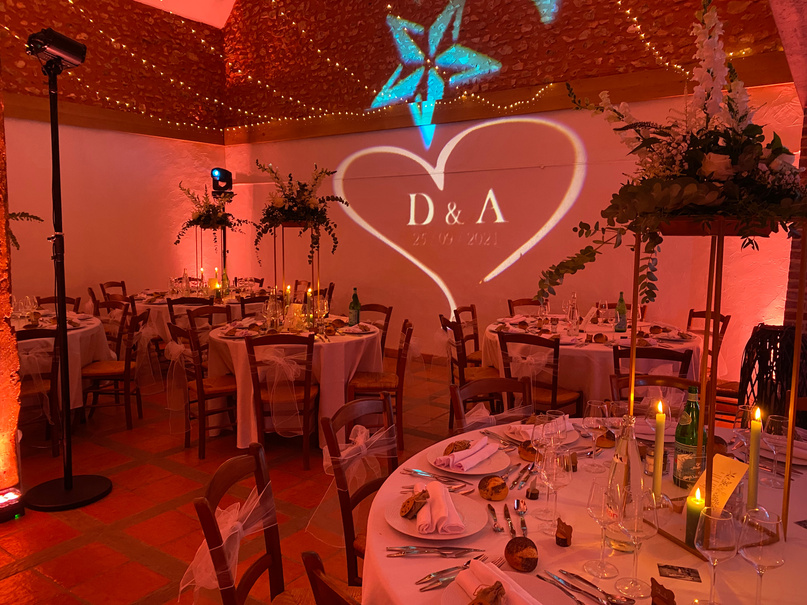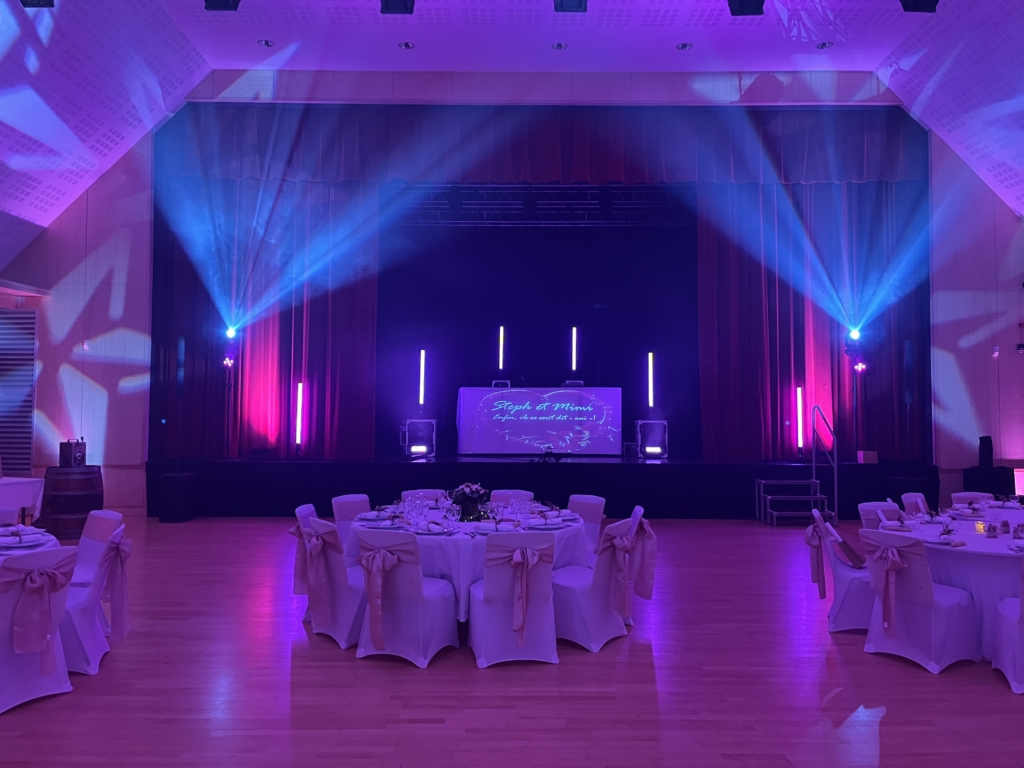 Le nombre de projecteurs sera adapté à votre lieu et votre configuration. Ils seront disposés au sol le long des murs. Au delà de l’aspect décoratif qui métamorphosera votre salle, cette option aura aussi l’intérêt de ne pas plonger dans le noir vos invités lors de la partie dansante et maintenir une certaine ambiance en limitant la fatigue