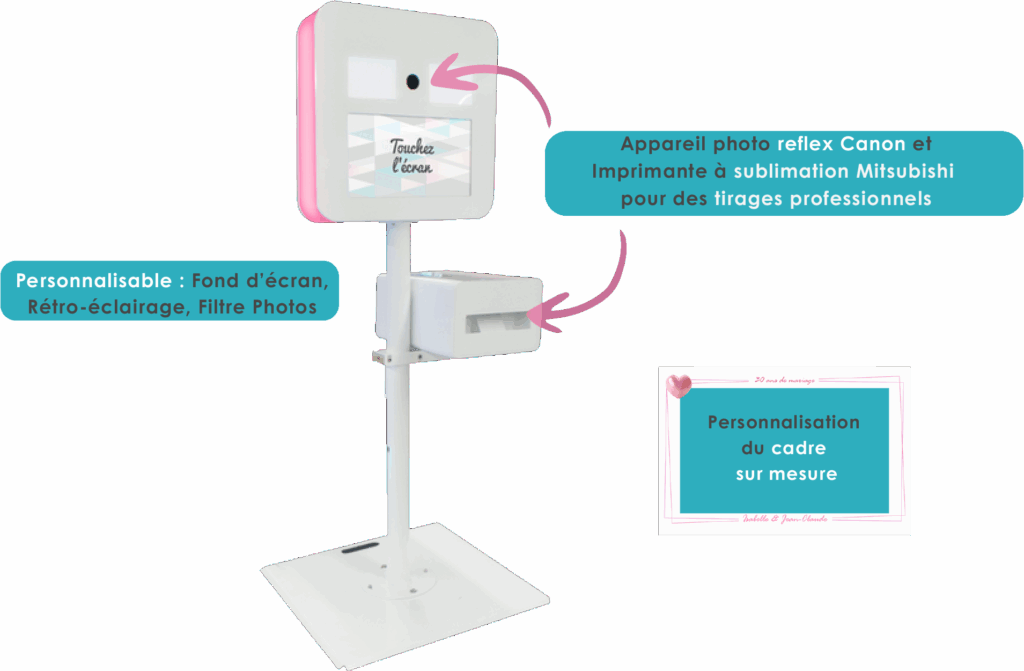 Tout est paramétrable: le nombre d’impressions possibles à chaque prise de vue, le format (en 10×15 paysage ou en bandelette de 5x15cm), l’image de l’écran de veille, la couleur de l’éclairage de la borne, etc…. La personnalisation du filtre photo vous est offerte afin que sur chaque photo apparaissent votre prénom, l’âge, la date, un symbole ou un message personnalisé, ….selon vos souhaits.