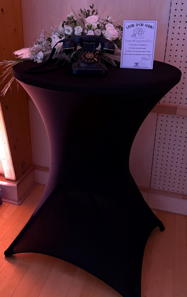 La prestation comprend le téléphone avec une autonomie de 12h00 (aucun branchement nécessaire) et une mémoire de plusieurs heures d’enregistrement, mais également un mange debout avec sa housse en lycra noir et un panneau explicatif qui pourra être personnalisé. Il pourra aisément être déplacé du cocktail à la salle en cours de soirée.