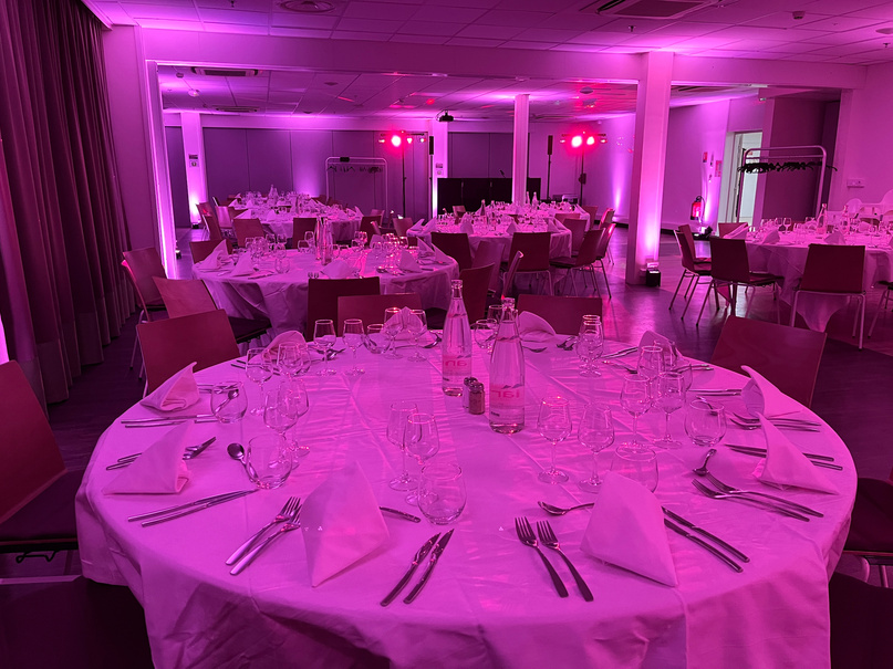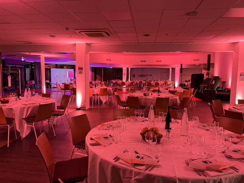 Plusieurs « programmes » lumineux avec des couleurs et des dynamiques différentes permettront de mettre en valeur les différents moments de la soirée (éclairage fixe vers la salle et le plafond pour les moments « repas », d’autres vers la piste de danse pour les interventions, les animations, etc… et enfin d’autres programmes plus dynamiques pour la partie dansante)