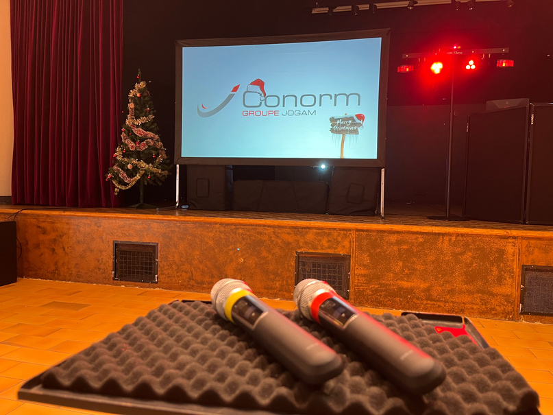 - Un grand écran 2.50m sur trépied + vidéoprojecteur HD (installés au moment de l’utilisation puis tout de suite démontés)